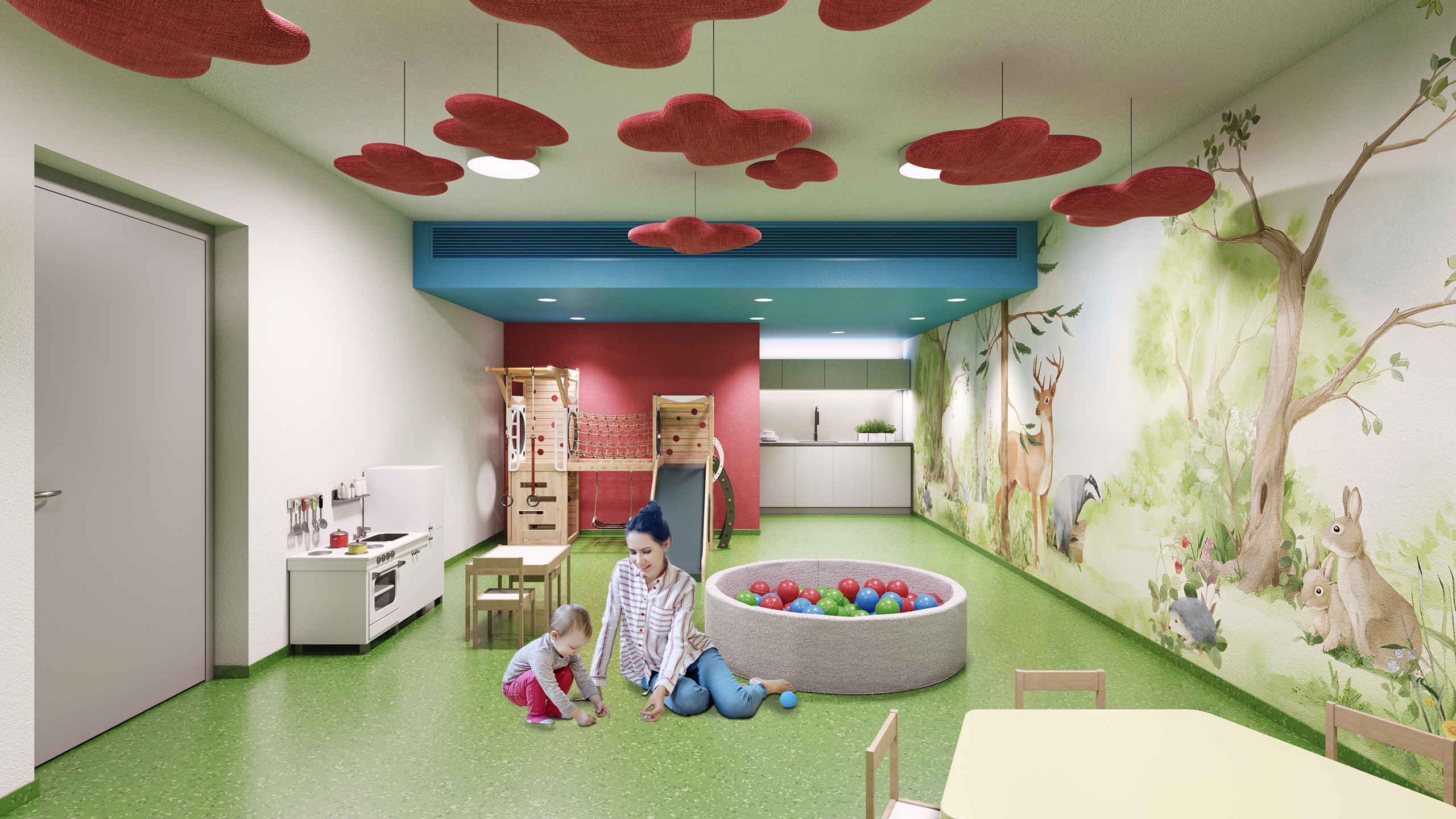 Das bedeutet: Räume, die Gemeinschaft ermöglichen, ohne sie zu erzwingen. Ein Kino-/TV- und Screeningraum für Filmabende oder private Vorführungen. Ein Koch- und Gemeinschaftsraum, in dem man gemeinsam essen, kochen, feiern kann – vom schnellen Afterwork bis zum entspannten Dinner. Für die Kleinen gibt es einen eigenen Spielbereich, der Freiraum schafft für Entwicklung und Abenteuer. Ergänzt um praktische Services wie Paketabholung und gut organisierte Fahrradbereiche entsteht ein ganz eigenes Wohngefühl: durchdacht, urban, gemeinschaftlich.